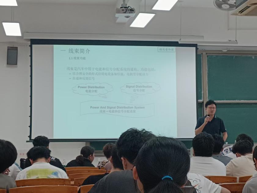 李仁坚以“技术赋能:线束设计的创新与实践”为题,从基础概念切入,介绍了汽车线束作为“车辆神经系统”的关键作用。他结合目前主流车型的线束架构案例,为学生讲解了线束回路设计如何通过拓扑优化信号,以及径路设计中轻量化材料与模块化布局如何提升整车能效;在线束设计上,李仁坚介绍了不同工作环境线束需采用特定的材料来维持线束工作正常。他特别提到,随着新能源车型的普及,高压线束的绝缘性能与电磁兼容性已成为行业技术攻坚重点。在互动环节,同学们踊跃参与,李仁坚耐心解答学生从汽车设计到职业规划等问题,帮助学生日后制定更符合社会动态需求的发展规划。