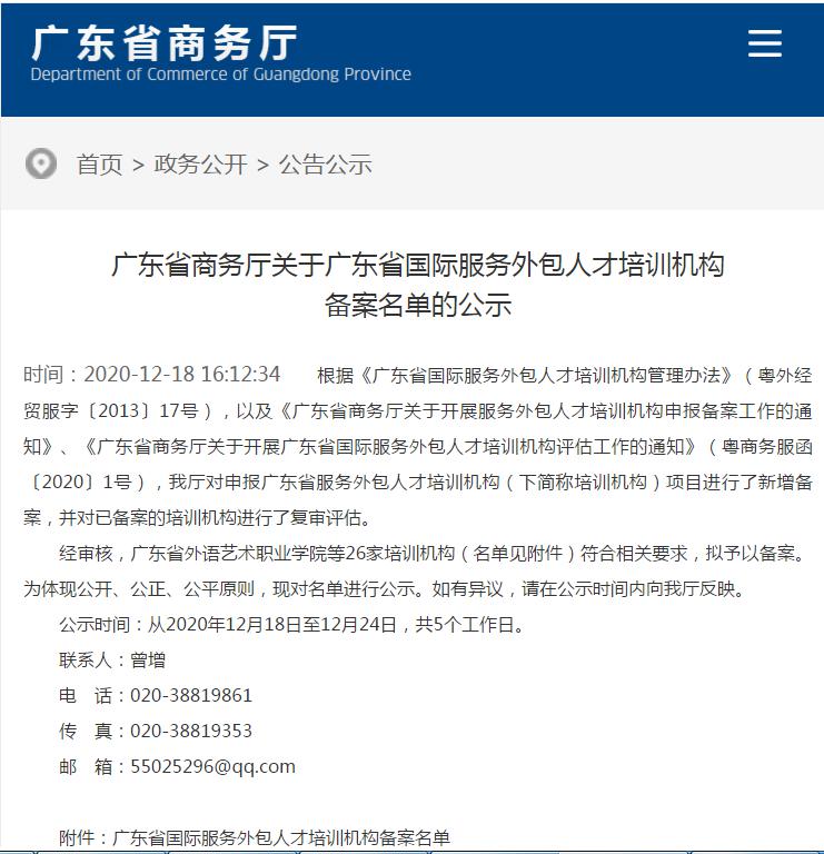 本网讯(记者 祝秀芬 王磊)12月25日,经广东省商务厅发布的广东省国际服务外包人才培训机构备案名单公示,华南理工大学广州学院被认定为广东省国际服务外包人才培训机构。